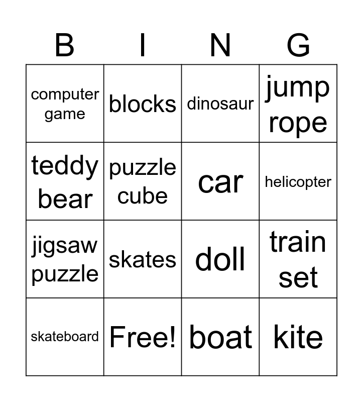 This bingo card has 21 words: Free!, ball, blocks, board game, boat, car, computer game, dinosaur, doll, helicopter, jigsaw puzzle, jump rope, kite, modeling clay, puzzle cube, robot, skateboard, skates, teddy bear, train set and yo-yo.