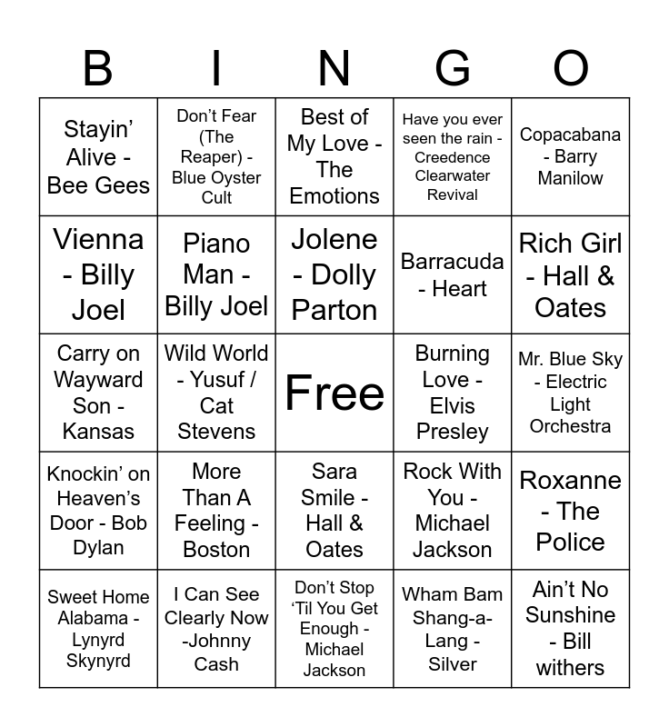 This bingo card has a free space and 26 words: Sara Smile - Hall & Oates, Wham Bam Shang-a-Lang - Silver, Jolene - Dolly Parton, I Can See Clearly Now -Johnny Cash, Copacabana - Barry Manilow, Stayin’ Alive - Bee Gees, Vienna - Billy Joel, Don’t Fear (The Reaper) - Blue Oyster Cult, Mr. Blue Sky - Electric Light Orchestra, Rock With You - Michael Jackson, Barracuda - Heart, Carry on Wayward Son - Kansas, Roxanne - The Police, Sweet Home Alabama - Lynyrd Skynyrd, Wild World - Yusuf / Cat Stevens, Take me home, Country Roads - John Denver, Have you ever seen the rain - Creedence Clearwater Revival, Knockin’ on Heaven’s Door - Bob Dylan, Best of My Love - The Emotions, Ain’t No Sunshine - Bill withers, Rich Girl - Hall & Oates, Don’t Stop ‘Til You Get Enough - Michael Jackson, Burning Love - Elvis Presley, More Than A Feeling - Boston, Piano Man - Billy Joel and Play That Funky Music - Wild Cherry.