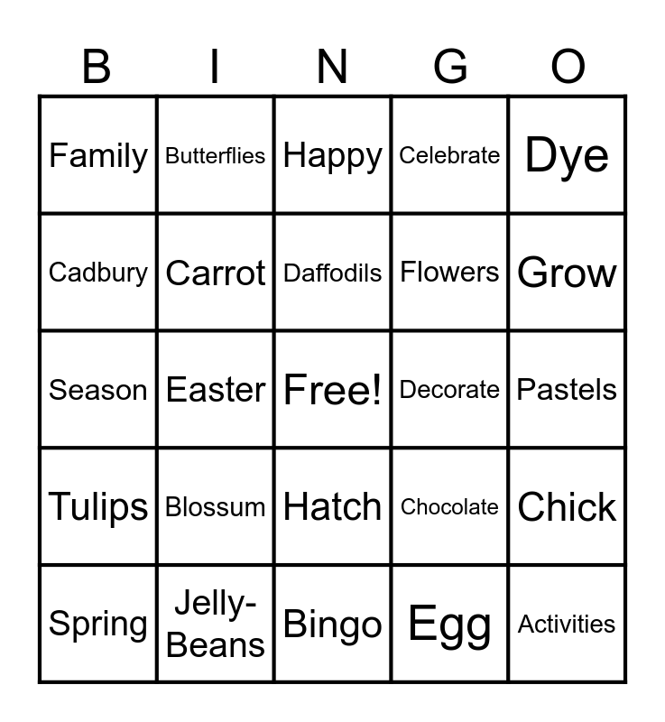 This bingo card has a free space and 50 words: April, Activities, Basket, Bingo, Blossum, Bunny, Butterflies, Break, Cadbury, Candy, Carrot, Celebrate, Chick, Chocolate, Color, Cottontail, Daffodils, Decorate, Duckling, Dye, Easter, Egg, Family, Flowers, Good-Friday, Grass, Grow, Ham, Happy, Hatch, Hide, Hop, Holiday, Hunt, Jelly-Beans, Lamb, Lillys, New, Nest, Pastels, Painting, Parade, Peeps, Rabbit, Spring, Season, Sunday, Sweet, Tulips and Traditions.