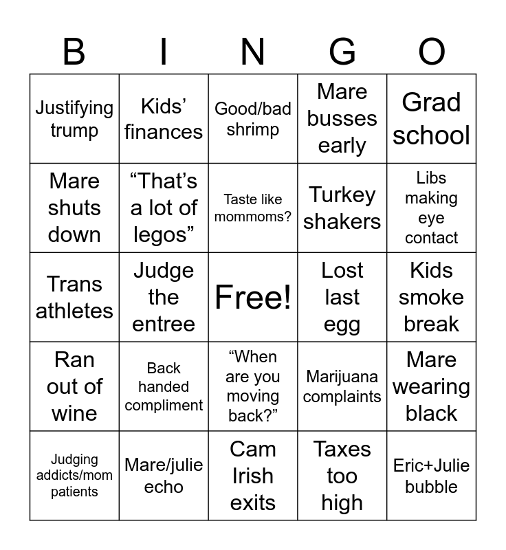 This bingo card has a free space and 28 words: Kev Irish exits, Mare/julie echo, Taste like mommoms?, Taxes too high, Grad school, Justifying trump, “That’s a lot of legos”, Cam Irish exits, Lost last egg, Mare wearing black, Trans athletes, Judge the entree, Marijuana complaints, Eric+Julie bubble, Mare shuts down, Mom can’t hear, “When are you moving back?”, Mare busses early, Libs making eye contact, Judging addicts/mom patients, Kids’ finances, Mary wearing pink, Turkey shakers, Kids smoke break, Ran out of wine, Back handed compliment, Good/bad shrimp and Trans bathrooms.