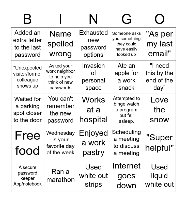 This bingo card has a free space and 29 words: A secure password keeper App/notebook, Changed your password in the last 72 hours, You can't remember the new password, Reset your password because you can't remember the recent changes., Added an extra letter to the last password, Exhausted new password options, Asked your work neighbor to help you think of new passwords, Wednesday is your favorite day of the week, Attempted to binge watch a program but fell asleep., Ran a marathon, Love the snow, Used liquid white out, Used white out strips, Internet goes down, "I need this by the end of the day", Can relate to the movie "The Devil Wears Prada", Enjoyed a work pastry, Free food, "As per my last email", Waited for a parking spot closer to the door, Scheduling a meeting to discuss a meeting, Rescue call from your work bestie (preplanned), Ate an apple for a work snack, "Unexpected visitor/former colleague shows up, Someone asks you something they could have easily looked up, Name spelled wrong, "Super helpful", Invasion of personal space and Teams or in person meeting?.
