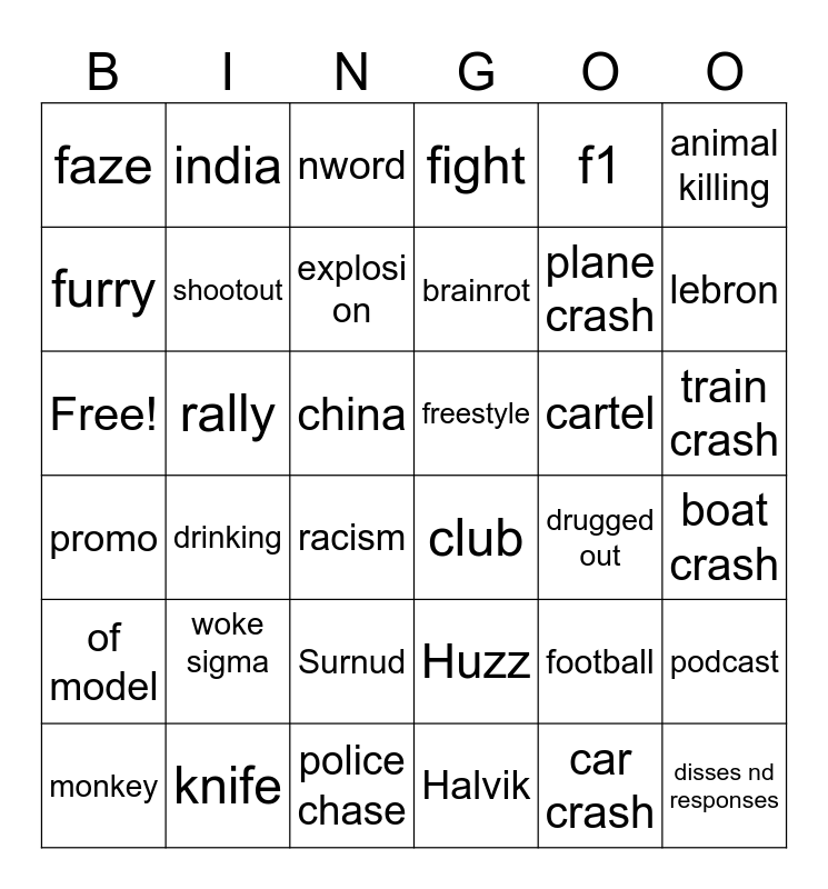 This bingo card has 36 words: Huzz, Surnud, Halvik, furry, promo, freestyle, shootout, police chase, f1, football, lebron, fight, podcast, rally, brainrot, faze, of model, cartel, Free!, nword, china, drinking, club, racism, drugged out, india, plane crash, knife, explosi on, animal killing, disses nd responses, monkey, boat crash, train crash, woke sigma and car crash.