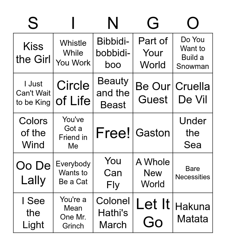This bingo card has a free space and 24 words: Everybody Wants to Be a Cat, You're a Mean One Mr. Grinch, Beauty and the Beast, I See the Light, Do You Want to Build a Snowman, Kiss the Girl, I Just Can't Wait to be King, Whistle While You Work, Gaston, You Can Fly, Be Our Guest, Colors of the Wind, A Whole New World, Bare Necessities, Circle of Life, Let It Go, Under the Sea, Bibbidi-bobbidi-boo, Cruella De Vil, You've Got a Friend in Me, Hakuna Matata, Oo De Lally, Part of Your World and Colonel Hathi's March.