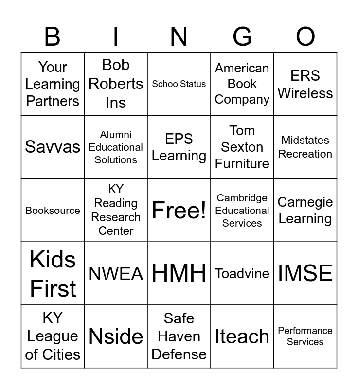 This bingo card has a free space and 44 words: Codel l Construction, Performance Services, Perfection Group, KY League of Cities, Schmidt-Arch, Iteach, SchoolStatus, Amplify, ERS Wireless, Nside, American Book Company, Cambridge Educational Services, HMH, NWEA, Great Minds, Safe Haven Defense, Stryker, Booksource, Infin Itecampus, Midstates Recreation, Bob Roberts Ins, Subject.com, Clotfelter- Samokar, Your Learning Partners, Compass Municipal, Carnegie Learning, Collaborative Classroom, Waterford, Toadvine, Kids First, GRREC, IMSE, Presentation Solutions, McGraw-Hill Education, KY Reading Research Center, Derivita, Accelerate Learning, American Fidelity, EPS Learning, Savvas, Tom Sexton Furniture, RossTarrant, Alumni Educational Solutions and Renaissance.