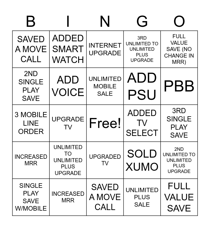 This bingo card has a free space and 24 words: UNLIMITED TO UNLIMITED PLUS UPGRADE, INCREASED MRR, UNLIMITED MOBILE SALE, SINGLE PLAY SAVE W/MOBILE, FULL VALUE SAVE (NO CHANGE IN MRR), SAVED A MOVE CALL, 2ND SINGLE PLAY SAVE, ADDED SMART WATCH, ADDED TV SELECT, UPGRADED TV, ADD PSU, 3 MOBILE LINE ORDER, SOLD XUMO, 2ND UNLIMITED TO UNLIMITED PLUS UPGRADE, ADD VOICE, UNLIMITED PLUS SALE, 3RD SINGLE PLAY SAVE, INTERNET UPGRADE, PBB, UPGRADE TV, FULL VALUE SAVE, INCREASED MRR, 3RD UNLIMITED TO UNLIMITED PLUS UPGRADE and SAVED A MOVE CALL.