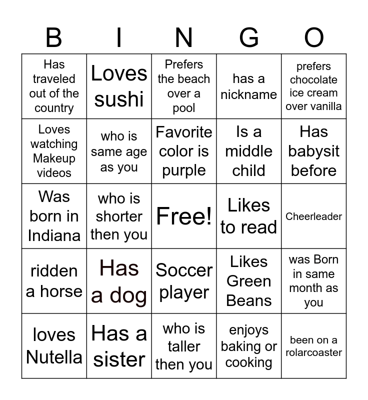 This bingo card has a free space and 24 words: Has a dog, Has a sister, Favorite color is purple, loves Nutella, prefers chocolate ice cream over vanilla, Has traveled out of the country, Loves watching Makeup videos, Loves sushi, Likes to read, Soccer player, Is a middle child, Was born in Indiana, Likes Green Beans, was Born in same month as you, who is same age as you, enjoys baking or cooking, Cheerleader, Prefers the beach over a pool, Has babysit before, who is shorter then you, been on a rolarcoaster, ridden a horse, has a nickname and who is taller then you.
