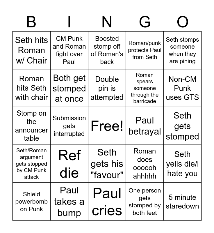This bingo card has a free space and 24 words: Ref die, Paul takes a bump, Double pin is attempted, Shield powerbomb on Punk, Seth stomps someone when they are pining, Seth hits Roman w/ Chair, Roman hits Seth with chair, CM Punk and Roman fight over Paul, Paul betrayal, Seth gets his "favour", Roman spears someone through the barricade, Stomp on the announcer table, Roman does oooooh ahhhhh, Seth yells die/i hate you, Both get stomped at once, One person gets stomped by both feet, Seth gets stomped, Boosted stomp off of Roman's back, Non-CM Punk uses GTS, Submission gets interrupted, 5 minute staredown, Seth/Roman argument gets stopped by CM Punk attack, Roman/punk protects Paul from Seth and Paul cries.