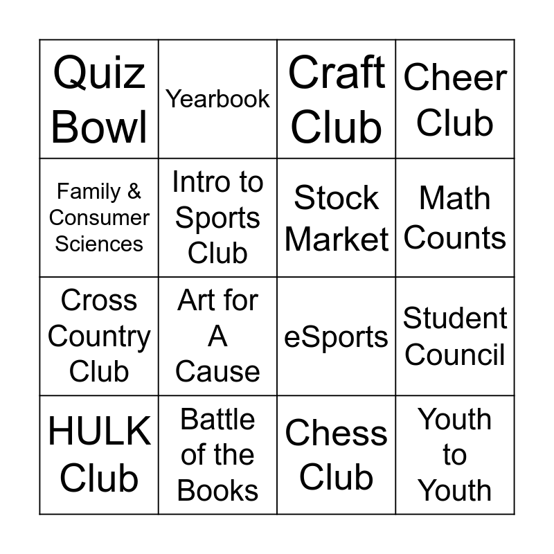 This bingo card has 16 words: Battle of the Books, Student Council, Craft Club, Quiz Bowl, Cross Country Club, Yearbook, eSports, Chess Club, Family & Consumer Sciences, Intro to Sports Club, HULK Club, Cheer Club, Art for A Cause, Math Counts, Stock Market and Youth to Youth.