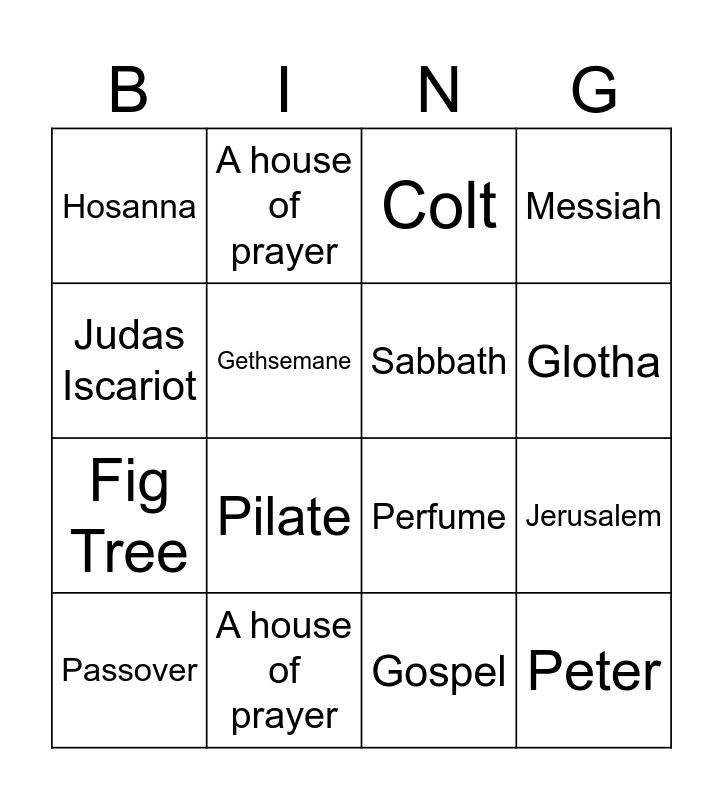 This bingo card has 16 words: A house of prayer, Jerusalem, Colt, Hosanna, Fig Tree, A house of prayer, Perfume, Gospel, Judas Iscariot, Gethsemane, Passover, Messiah, Pilate, Glotha, Sabbath and Peter.