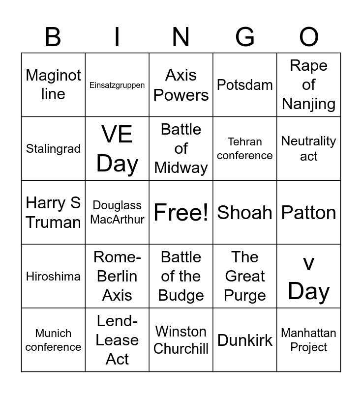 This bingo card has a free space and 24 words: Rome-Berlin Axis, Lend-Lease Act, Battle of Midway, Munich conference, Rape of Nanjing, Maginot line, Stalingrad, Einsatzgruppen, Shoah, Battle of the Budge, Tehran conference, Harry S Truman, The Great Purge, v Day, VE Day, Dunkirk, Patton, Axis Powers, Neutrality act, Douglass MacArthur, Manhattan Project, Hiroshima, Potsdam and Winston Churchill.