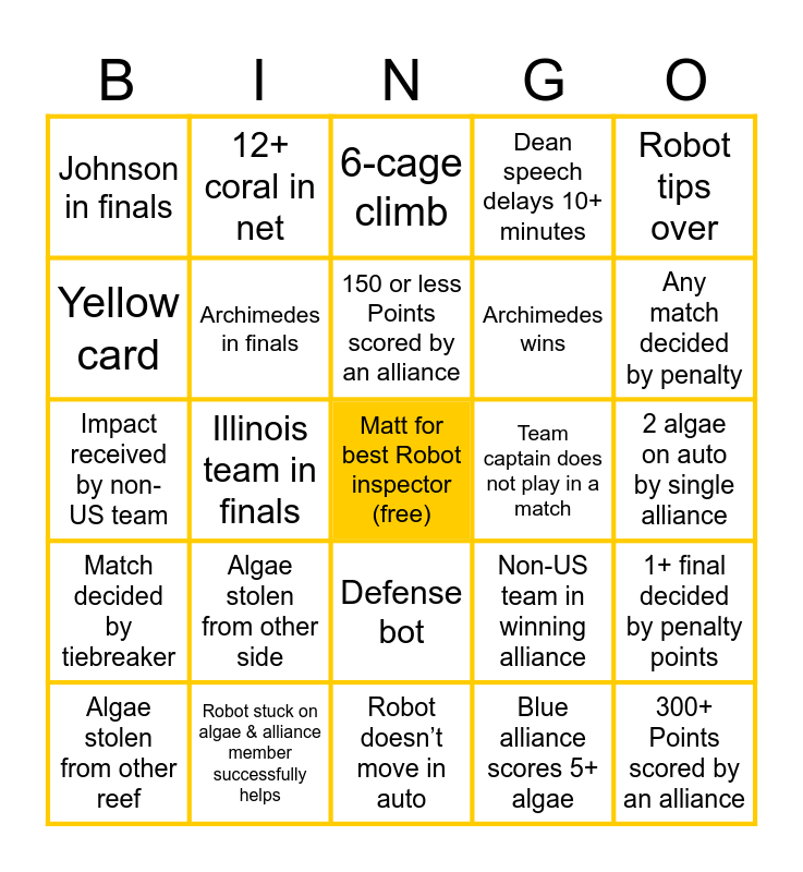 This bingo card has a free space and 30 words: Robot stuck on algae for rest of match, Robot stuck on algae & alliance member successfully helps, 6-cage climb, 5-cage climb, Robot tips over, Johnson in finals, Archimedes in finals, 150 or less Points scored by an alliance, Archimedes wins, 300+ Points scored by an alliance, Algae stolen from other reef, Algae stolen from other side, Blue alliance scores 5+ algae, Red alliance scores 3+ algae, Match decided by tiebreaker, Shallow climb, Robot doesn’t move in auto, Team captain does not play in a match, 1+ final decided by penalty points, Yellow card, Illinois team in finals, Both teams scored 250+, Dean speech delays 10+ minutes, 2 algae on auto by single alliance, Impact received by non-US team, 12+ coral in net, Defense bot, Non-US team in winning alliance, Any match decided by penalty and Police dog on field.