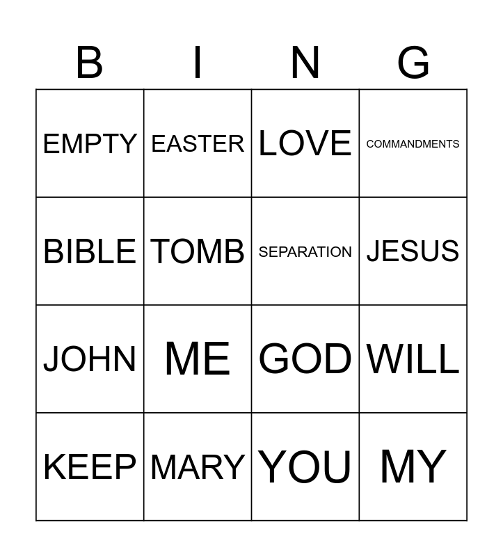 This bingo card has 24 words: Free!, SIN, JESUS, FAITH, BIBLE, EMPTY, TOMB, EASTER, MARY, PETER, JOHN, GOD, CROSS, DEATH, SEPARATION, IF, YOU, LOVE, ME, WILL, KEEP, MY, COMMANDMENTS and JOHN 14:15.