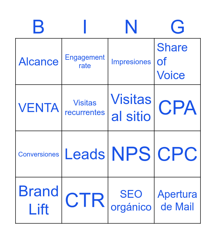 This bingo card has 16 words: CTR, CPC, Impresiones, Alcance, Conversiones, Engagement rate, NPS, SEO orgánico, VENTA, Visitas recurrentes, Brand Lift, Share of Voice, Leads, CPA, Visitas al sitio and Apertura de Mail.