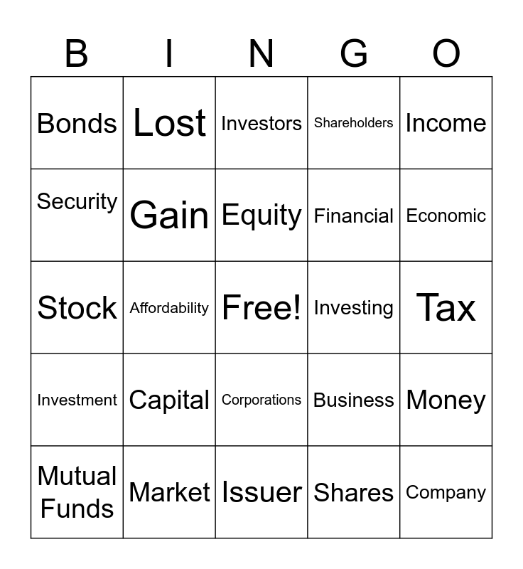 This bingo card has a free space and 24 words: Mutual Funds, Capital, Equity, Shares, Income, Bonds, Lost, Investors, Investing, Tax, Stock, Gain, Business, Money, Security, Market, Issuer, Shareholders, Economic, Investment, Affordability, Corporations, Financial and Company.