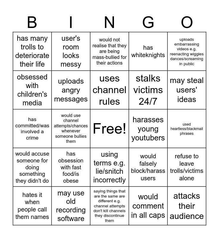 This bingo card has a free space and 24 words: has obsession with fast food/is obese, may use old recording software, uses channel rules, hates it when people call them names, uploads embarrassing videos e.g. reenacting wiggles dances/screaming in public, has many trolls to deteriorate their life, obsessed with children's media, user's room looks messy, harasses young youtubers, using terms e.g. lie/snitch incorrectly, stalks victims 24/7, has committed/was involved a crime, would falsely block/harass users, refuse to leave trolls/victims alone, uploads angry messages, would comment in all caps, used heartless/blackmail phrases, would not realise that they are being mass-bullied for their actions, may steal users' ideas, would use channel attempts/chances whenever someone bullies them, attacks their audience, would accuse someone for doing something they didn't do, has whiteknights and saying things that are the same are different e.g. channel attempts don't kill channels they discontinue them.