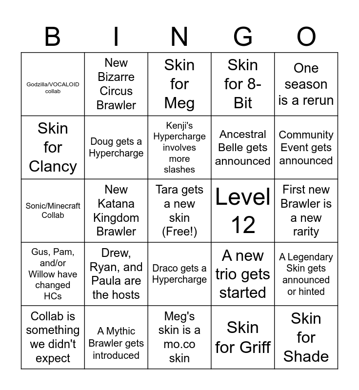 This bingo card has a free space and 24 words: Drew, Ryan, and Paula are the hosts, A Mythic Brawler gets introduced, Kenji's Hypercharge involves more slashes, Collab is something we didn't expect, One season is a rerun, Godzilla/VOCALOID collab, Skin for Clancy, New Bizarre Circus Brawler, Level 12, Draco gets a Hypercharge, Ancestral Belle gets announced, Sonic/Minecraft Collab, A new trio gets started, A Legendary Skin gets announced or hinted, Doug gets a Hypercharge, Skin for Griff, First new Brawler is a new rarity, Skin for Meg, Community Event gets announced, New Katana Kingdom Brawler, Skin for Shade, Gus, Pam, and/or Willow have changed HCs, Skin for 8-Bit and Meg's skin is a mo.co skin.