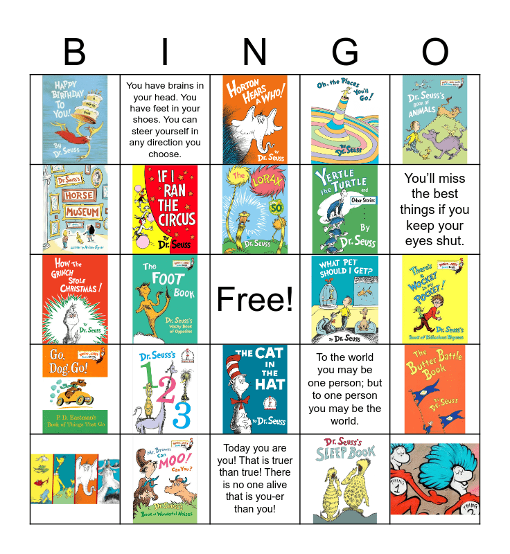 This bingo card has 31 images and 9 words: Free!, Oh the things you can find, if you don’t stay behind!, To the world you may be one person; but to one person you may be the world., You’ll miss the best things if you keep your eyes shut., Today you are you! That is truer than true! There is no one alive that is you-er than you!, Today was good. Today was fun. Tomorrow is another one., The more that you read, the more things you will know. The more that you learn, the more places you’ll go., You have brains in your head. You have feet in your shoes. You can steer yourself in any direction you choose. and Why fit in when you were born to stand out?.