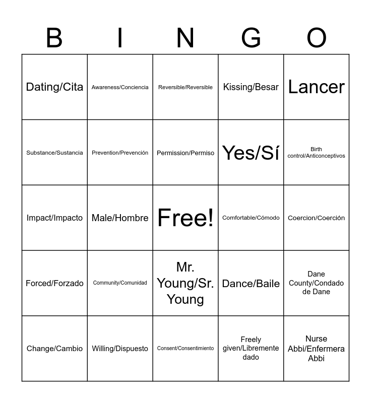 This bingo card has a free space and 25 words: Community/Comunidad, Consent/Consentimiento, Permission/Permiso, Change/Cambio, Lancer, Dating/Cita, Substance/Sustancia, Awareness/Conciencia, Comfortable/Cómodo, Mr. Young/Sr. Young, Yes/Sí, Impact/Impacto, Dance/Baile, Dane County/Condado de Dane, Prevention/Prevención, Party/Fiesta, Coercion/Coerción, Reversible/Reversible, Birth control/Anticonceptivos, Male/Hombre, Nurse Abbi/Enfermera Abbi, Willing/Dispuesto, Forced/Forzado, Kissing/Besar and Freely given/Libremente dado.