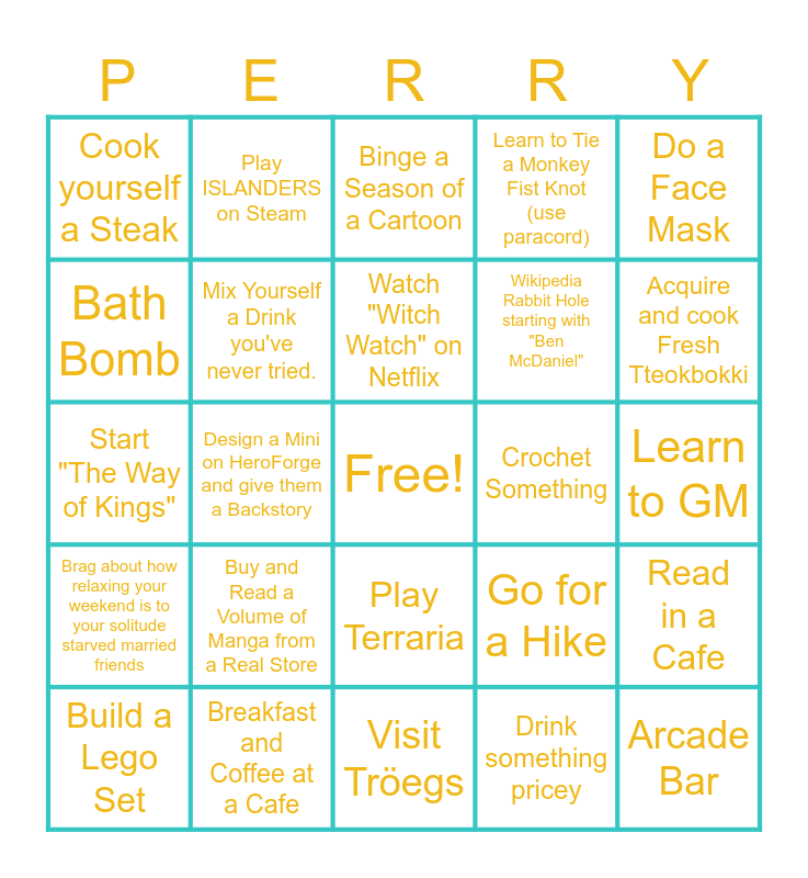 This bingo card has a free space and 24 words: Buy and Read a Volume of Manga from a Real Store, Breakfast and Coffee at a Cafe, Watch "Witch Watch" on Netflix, Build a Lego Set, Do a Face Mask, Cook yourself a Steak, Bath Bomb, Play ISLANDERS on Steam, Crochet Something, Play Terraria, Wikipedia Rabbit Hole starting with "Ben McDaniel", Start "The Way of Kings", Go for a Hike, Read in a Cafe, Mix Yourself a Drink you've never tried., Drink something pricey, Learn to GM, Binge a Season of a Cartoon, Acquire and cook Fresh Tteokbokki, Design a Mini on HeroForge and give them a Backstory, Arcade Bar, Brag about how relaxing your weekend is to your solitude starved married friends, Learn to Tie a Monkey Fist Knot (use paracord) and Visit Tröegs.