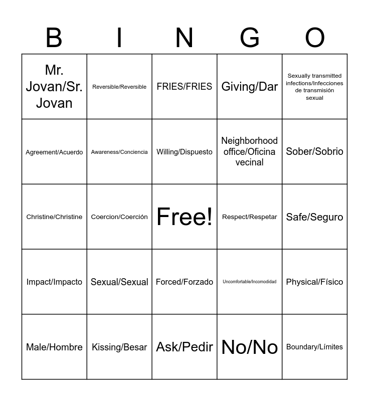 This bingo card has a free space and 25 words: Sexual/Sexual, Ask/Pedir, Willing/Dispuesto, Male/Hombre, Sexually transmitted infections/Infecciones de transmisión sexual, Mr. Jovan/Sr. Jovan, Agreement/Acuerdo, Reversible/Reversible, Respect/Respetar, Forced/Forzado, Neighborhood office/Oficina vecinal, Christine/Christine, Uncomfortable/Incomodidad, Physical/Físico, Awareness/Conciencia, Illegal/Ilegal, Safe/Seguro, FRIES/FRIES, Sober/Sobrio, Coercion/Coerción, Boundary/Límites, Kissing/Besar, Impact/Impacto, Giving/Dar and No/No.
