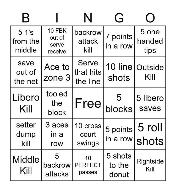 This bingo card has a free space and 24 words: 3 aces in a row, 5 backrow attacks, Serve that hits the line, Middle Kill, 5 one handed tips, 5 1's from the middle, save out of the net, 10 FBK out of serve receive, 5 blocks, 10 cross court swings, 10 line shots, Libero Kill, 5 points in a row, 5 roll shots, Ace to zone 3, 5 shots to the donut, 5 libero saves, backrow attack kill, Outside Kill, tooled the block, Rightside Kill, setter dump kill, 7 points in a row and 10 PERFECT passes.