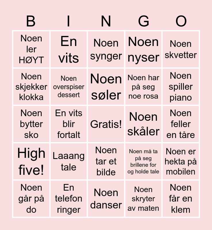 This bingo card has a free space and 29 words: Noen går på do, Noen sier «jeg husker når…», En vits blir fortalt, Noen nevner corona, Noen ler HØYT, Noen synger, Noen overspiser dessert, Laaang tale, Noen skåler, En telefon ringer, Noen feller en tåre, Noen får en klem, Noen danser, Noen skryter av maten, Noen spiller piano, Noen løsner på klerene etter maten, Noen tar et bilde, High five!, Noen skvetter, Noen bytter sko, Noen må ta på seg brillene for og holde tale, Du ser et dyr _______, Noen har på seg noe rosa, Noen skjekker klokka, Noen nyser, En vits, Noen er hekta på mobilen, Noen søler and Noen snubler.