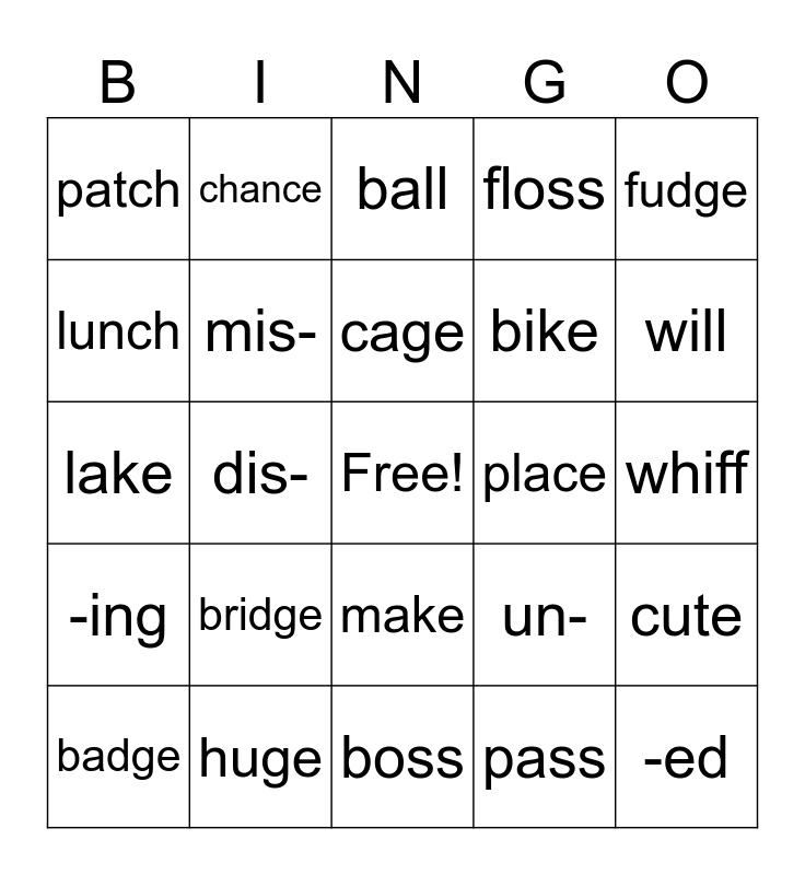 This bingo card has a free space and 24 words: bridge, huge, cage, badge, fudge, patch, lunch, chance, place, make, bike, lake, un-, cute, mis-, pass, whiff, ball, will, dis-, -ed, -ing, floss and boss.
