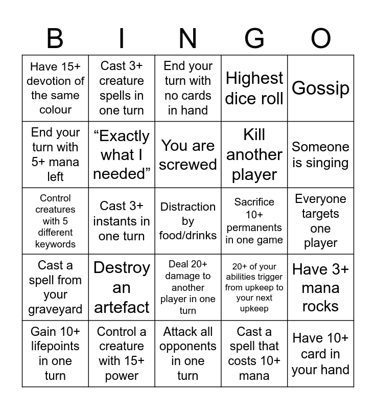 This bingo card has 145 words: Turn one Sol Ring, „Too OP“, „Can I take this back?”, Infinity combo, 10+ of your abilities trigger in your turn, 20+ of your abilities trigger from upkeep to your next upkeep, Forgetting a trigger, Trigger the same ability 20+ times (except commander), Trigger the same ability 3+ times in one turn, Make Politics, Cast your commander 3+ times, Commander enters the battlefield 5+ times, Use 15+ Mana in one turn, Control 10+ non-token creatures, Control 10+ token creatures, Control 20+ creatures, Control 10+ non-token artefacts, Control 10+ token artefacts, Control 20+ artefacts, Control 10+ lands, Have a mana-dork, Have 3+ mana rocks, Cast 3+ sorceries or instants in one turn, Counter spell, Cast 3+ sorceries in one turn, Cast 3+ instants in one turn, Cast 3+ creature spells in one turn, Cast 5+ spells in one turn, Cast a boardwipe, Ask for a boardwipe, 5+ Creatures enter your battlefield in one turn, “Why me”, Take damage from all other players in one round, Everyone targets one player, Lose the game first, Win the game, Second place, Third place, Kill another player, Kill another player with commander damage, Use 3+ ramp spells, Deal 20+ damage to other players in one turn, Deal 20+ damage to another player in one turn, Deal 100+ damage to creatures in one game, Rule discussion, Somebody has to look up the rules, Discussion of stack order, Get 20+ damage in one turn, Attack with 10+ creatures at once, 3+ of your creatures die by blocking at once, Block a total of 50+ damage, Block 20+ damage in one turn, Gain 10+ lifepoints in one turn, Gain 50+ lifepoints in one game, Lose at least half of your lifepoints in one turn, Take 30+ damage in one turn and survive, Survive one turn with 1 lifepoint left, Win the game with 1 lifepoint left, Kill 2+ players in one turn, “I am no threat”, End your turn with no cards in hand, Have 10+ card in your hand, Discards cards from your hand due to handsize, Discard a card from your hand, Sacrifice a creature, Sacrifice 10+ permanents in one game, Cast a spell from your graveyard, Flieger sind die Sieger, Unblockbar, Save another player from being defeated, Have more cards in your graveyards than in your library, Kill a commander, Have 15+ devotion of the same colour, Draw 10+ cards in one turn, Someone asks to see your card, “I was not paying attention”, Someone goes to toilet 3+ times in one game, Game lasts 2+ hours, One turn lasts 10+ minutes, Highest dice roll, Lowest dice roll, 2+ Mulligans, Cast a spell on each of the first 4 turns, Land drop on the first 5 turns, Cast a planeswalker, Draw first blood!, Control 7+ creatures of the same type, Cast 2+ ramp spells in one turn, 3+ abilities trigger in your upkeep, Attack all opponents in one turn, Lose 5+ non-token creatures in one turn, Lose 10+ creatures in one turn, Have total power of 50+ on your battlefield, Have total toughness of 50+ on your battlefield, Control a creature with 15+ power, Have 5+ of +1/+1 counters on your battlefield, Have 20+ counters on your battlefield, Control a god creature, Control creatures with 5 different keywords, Control creatures with 5+ times the same keyword, Someone counts their mana 2+ times in a row, End your turn with 5+ mana left, End your turn with 3+ untapped lands, Missing a colour, You are flooded, You are screwed, 2+ players unite against you, “I am the danger”, “Someone has to destroy that”, Counter a counter spell, Counter your own spell, Destroy an artefact, Destroy an enchantment, Someone is singing, Someone makes a bad pun, Distraction by food/drinks, Gossip, Destroy a land, Have 5+ different card types in your graveyard, Have 5+ different card types on your battlefield, Have 10+ of the same card types in your graveyard, Destroy 10+ creatures, Destroy 5+ creatures in one turn, Mill 10+ cards in one turn, Cast a spell that costs 10+ mana, Steal another player’s card, Cast another player’s card, Someone casts a spell during someone else’s upkeep, Backstab, Bring an opponent’s lifepoints exactly to 0, Overkill: bring an opponent’s lifepoints to -10, Deal 15+ damage to one creature, Win with a non-combat win condition, Play a card that makes everyone groan, Use a card from before 2010, Bounce 3+ things in one turn, Cast a card from exile, Copy a card, Someone is really happy about their starting hand, Someone is really happy about their draw, “Exactly what I needed”, Your draw is exactly what you needed, Someone makes a reference that nobody gets, Game lasts less than 30 minutes and You get killed in less than 30 minutes.