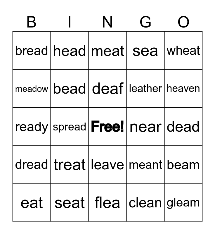 This bingo card has a free space and 24 words: treat, seat, deaf, eat, wheat, bread, meadow, head, near, leave, leather, ready, meant, beam, bead, clean, dead, meat, heaven, spread, gleam, dread, sea and flea.