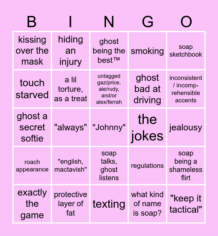 This bingo card has a free space and 36 words: sparring, call and response, soap and gaz besties, a lil torture, as a treat, regulations, roach appearance, untagged gaz/price, ale/rudy, and/or alex/ferrah, leadership skills, soap sketchbook, soap's family, "always", smoking, Ghost's name disregarded/ never revealed, the jokes, inconsistent / incomp-rehensible accents, kissing over the mask, kortac mentioned for no clear reason, "english, mactavish", "keep it tactical", ghost being the best™️, jealousy, soap being a shameless flirt, protective layer of fat, exactly the game, texting, hiding an injury, ghost a secret softie, soap wearing a mask, ghost bad at driving, touch starved, not a good man, bed too small but magically isn't, what kind of name is soap?, soap talks, ghost listens, face reveal and Las Almas mentioned in the weirdest way.