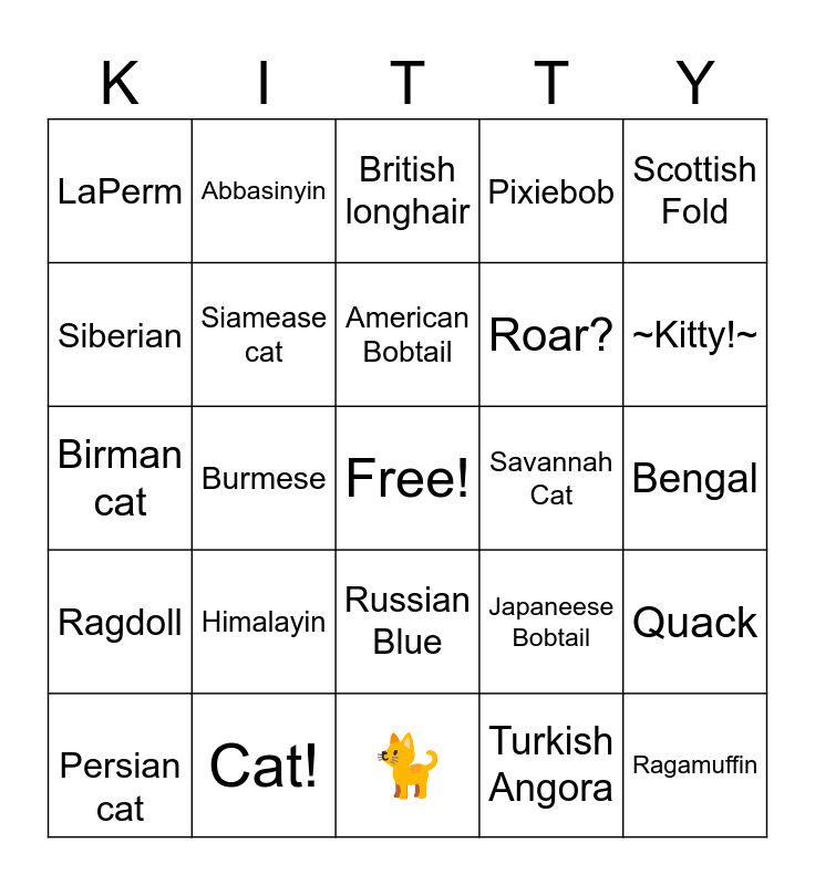 This bingo card has a free space and 34 words: Munchkin Cats, Turkish Angora, Manx Cat, Pastel Calico, Ragdoll, Siamease cat, Scottish Fold, Persian cat, Abbasinyin, british Shorthair, American Bobtail, British longhair, Meow!, Australian Mist, Savannah Cat, ~Kitty!~, Cat!, Birman cat, Himalayin, Japaneese Bobtail, Russian Blue, QUACKITTY!, LaPerm, Bengal, 🐈, Ragamuffin, Pixiebob, Fluffball, Roar?, Siberian, Cornish Rex, Burmese, Quack and FLUFFY!!!.