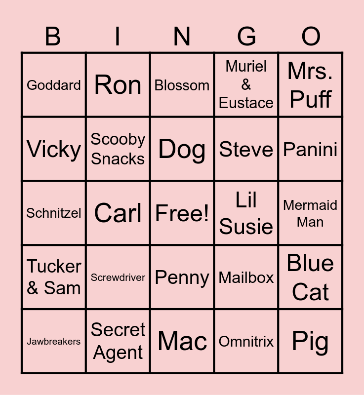 This bingo card has a free space and 68 words: Dipper & Mabel, Pig, Perry, Candace, 626, Nani, Ron, Rufus, Dog, Rainforest, Penny, Oscar & Trudy, Mermaid Man, Mrs. Puff, Crimson Chin, Vicky, Carl, Goddard, Phil & Lil, Screwdriver, Steve, Mailbox, Tucker & Sam, Ghost Portal, Otis, Mouse, Cat, BlueMouse, Blue Cat, Darwin, Blossom, Him, DeeDee, Keypad, Muriel & Eustace, Green Mask, Double D, Jawbreakers, Panini, Schnitzel, Grim, Billy, Scooby Snacks, Scrappy-Doo, Raccoon, Groundskeeper, Cyborg, Starfire, Lil Susie, Secret Agent, Susan & Mary, Dukey, Bloo, Mac, Nigel Uno, Number 5, Omnitrix, Grandpa Max & Gwen, Candy Kingdom, Jake, K’nuckles, Candied Island, Shapeshift, Master Shake, Red Guy, Supercow, Brian and Stewie.