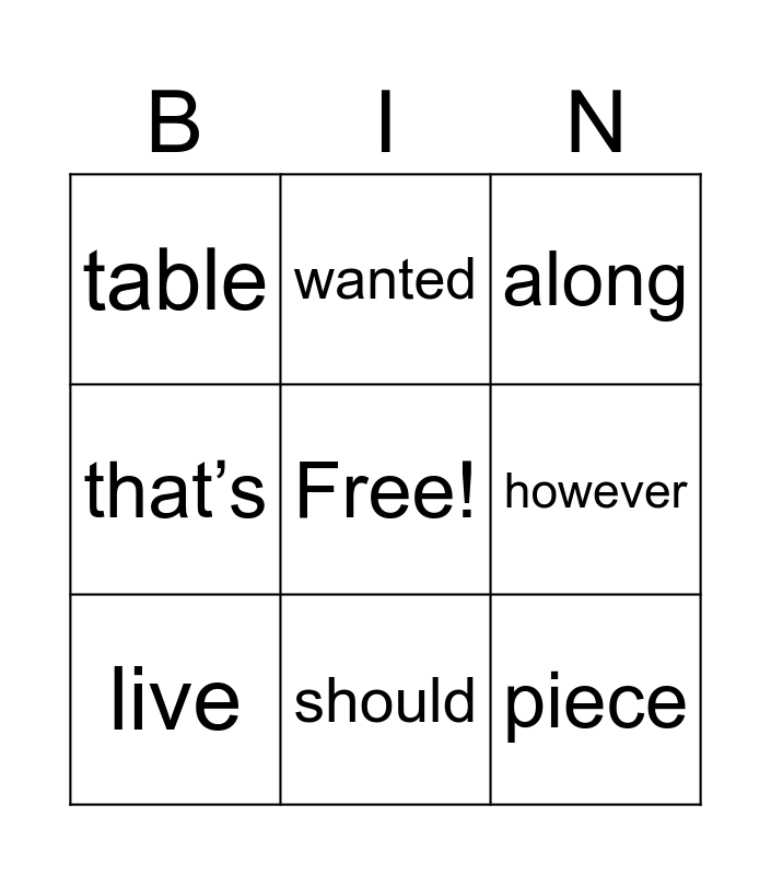 This bingo card has a free space and 20 words: above, again, along, myself, once, piece, something, table, they, wanted, couldn’t, don’t, however, I’ll, live, put, should, that’s, very and you’re.