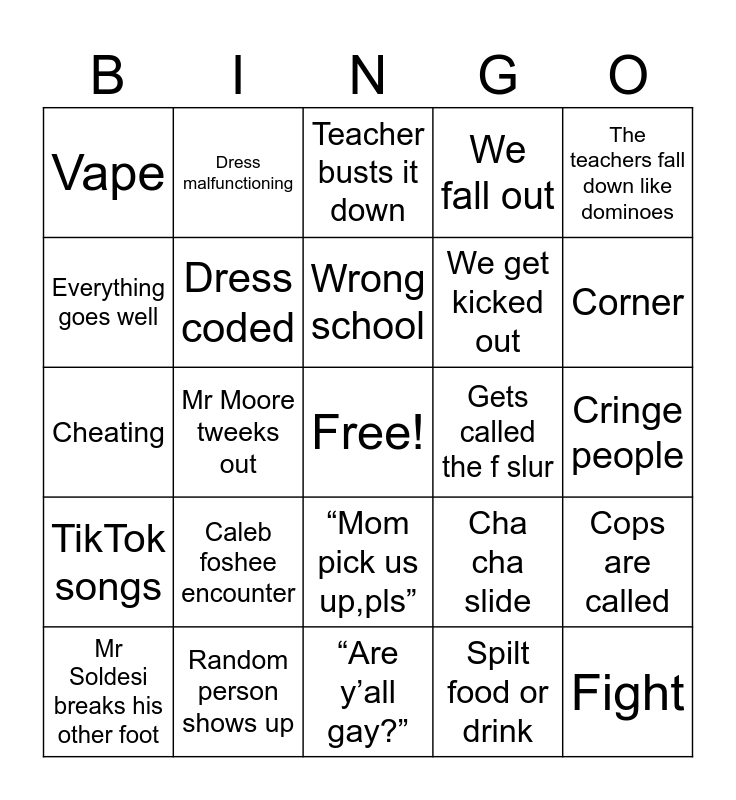 This bingo card has a free space and 37 words: Punch spiked, We fall, Teachers fall, We get kicked out, Cops are called, Mr Soldesi breaks his other foot, Mr Moore tweeks out, Mrs pits gives a speech, We fall out, Break up, Cheating, Dress coded, “Are y’all gay?”, Gets called the f slur, The teachers fall down like dominoes, TikTok songs, Odd music, Teacher busts it down, Cha cha slide, Corner, Vape, Caleb foshee encounter, “Mom pick us up,pls”, Spilt food or drink, Crying, Batman reference, Dress malfunctioning, Someone’s storms out, Drugs, Fight, Drama, Random person shows up, Wrong school, Bullying, Cringe people, Everything goes well and Death.