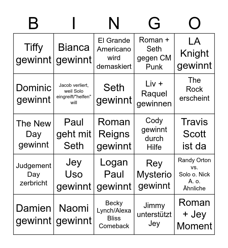 This bingo card has a free space and 24 words: Jey Uso gewinnt, Naomi gewinnt, Seth gewinnt, Damien gewinnt, LA Knight gewinnt, Tiffy gewinnt, Dominic gewinnt, Bianca gewinnt, Cody gewinnt durch Hilfe, Logan Paul gewinnt, Liv + Raquel gewinnen, The New Day gewinnt, Rey Mysterio gewinnt, Randy Orton vs. Solo o. Nick A. o. Ähnliche, Jacob verliert, weil Solo eingreift/"helfen" will, Jimmy unterstützt Jey, Travis Scott ist da, El Grande Americano wird demaskiert, The Rock erscheint, Paul geht mit Seth, Roman + Jey Moment, Judgement Day zerbricht, Roman + Seth gegen CM Punk and Becky Lynch/Alexa Bliss Comeback.