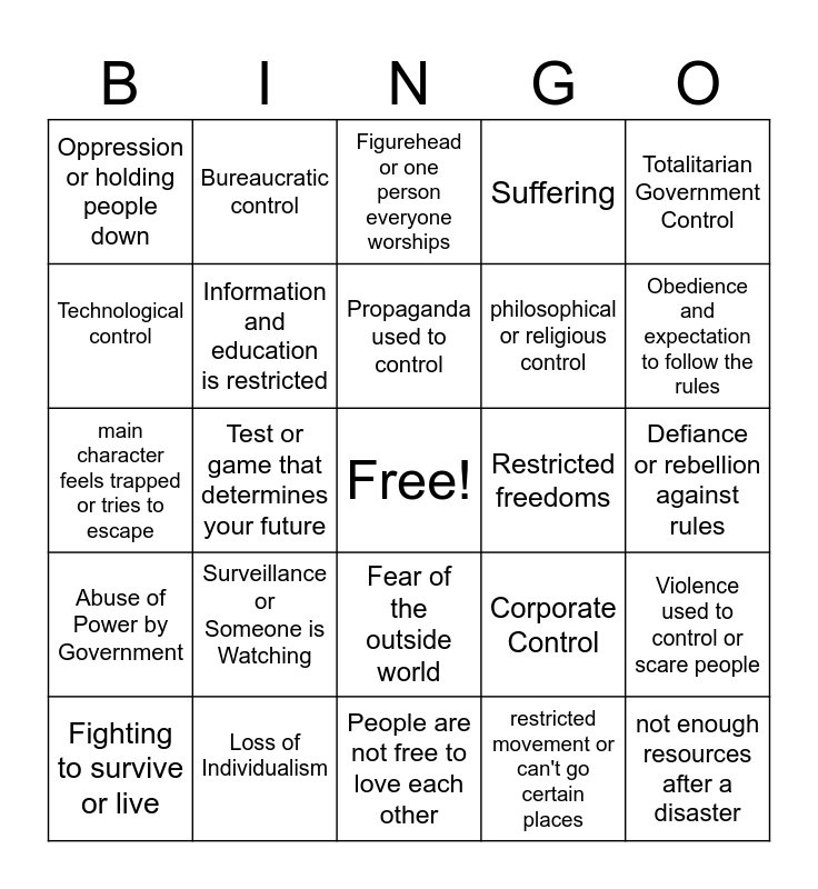 This bingo card has a free space and 24 words: Surveillance or Someone is Watching, Loss of Individualism, Propaganda used to control, Fighting to survive or live, Totalitarian Government Control, Oppression or holding people down, Technological control, Bureaucratic control, Restricted freedoms, Fear of the outside world, philosophical or religious control, main character feels trapped or tries to escape, Corporate Control, Violence used to control or scare people, Information and education is restricted, restricted movement or can't go certain places, Defiance or rebellion against rules, Figurehead or one person everyone worships, Obedience and expectation to follow the rules, Test or game that determines your future, not enough resources after a disaster, Abuse of Power by Government, Suffering and People are not free to love each other.