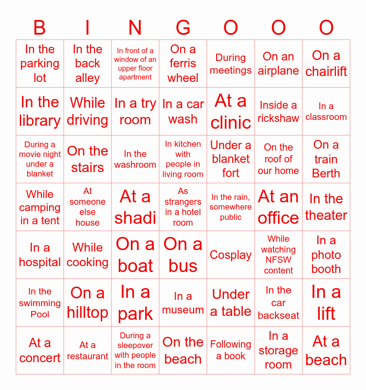 This bingo card has a free space and 48 words: Under a table, Inside a rickshaw, On the beach, At someone else house, In the washroom, In the theater, In the back alley, At a restaurant, On an airplane, On a bus, On a chairlift, On a ferris wheel, On the roof of our home, Under a blanket fort, In the swimming Pool, At an office, In the library, In a classroom, In the car backseat, During meetings, At a clinic, At a shadi, In the parking lot, While driving, In a lift, In a try room, On a train Berth, At a concert, In kitchen with people in living room, On the stairs, In a storage room, In the rain, somewhere public, In a photo booth, On a hilltop, While camping in a tent, Cosplay, While watching NFSW content, During a movie night under a blanket, On a boat, In a park, In a hospital, At a beach, In front of a window of an upper floor apartment, During a sleepover with people in the room, In a car wash, In a museum, While cooking and Following a book.