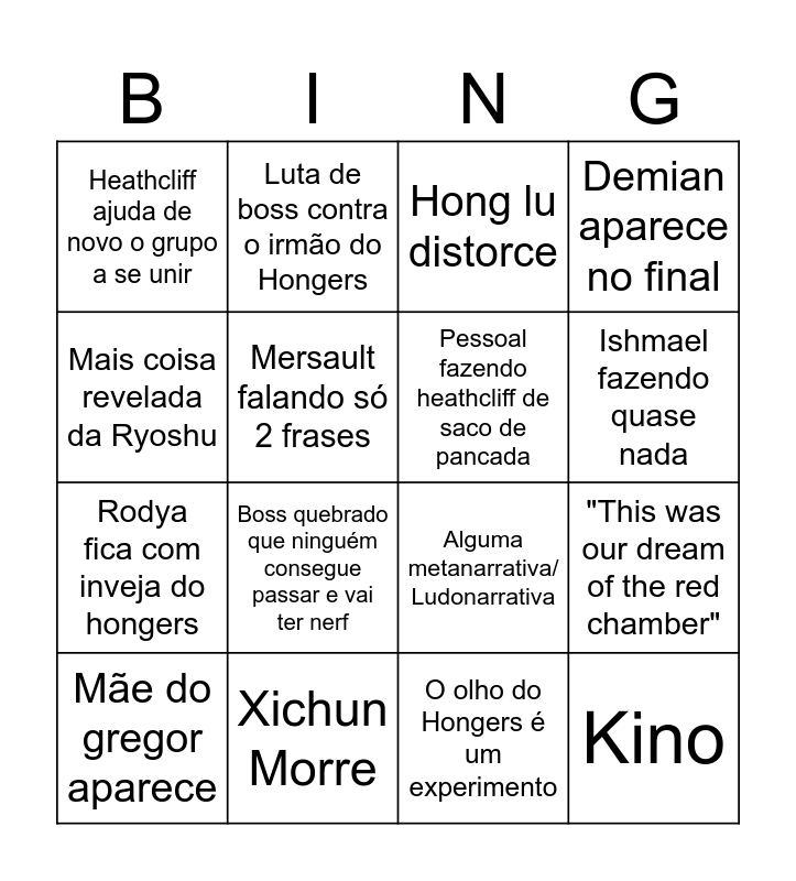 This bingo card has 16 words: Xichun Morre, "This was our dream of the red chamber", Hong lu distorce, Heathcliff ajuda de novo o grupo a se unir, Rodya fica com inveja do hongers, Luta de boss contra o irmão do Hongers, Alguma metanarrativa/ Ludonarrativa, O olho do Hongers é um experimento, Mais coisa revelada da Ryoshu, Mersault falando só 2 frases, Mãe do gregor aparece, Demian aparece no final, Boss quebrado que ninguém consegue passar e vai ter nerf, Ishmael fazendo quase nada, Pessoal fazendo heathcliff de saco de pancada and Kino.