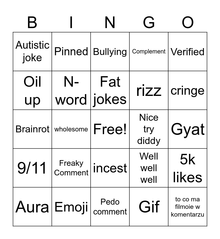 This bingo card has a free space and 24 words: Aura, Freaky Comment, Fat jokes, Gif, Verified, Autistic joke, Pinned, Bullying, Nice try diddy, Gyat, Brainrot, N-word, Well well well, 5k likes, Oil up, Emoji, Pedo comment, Complement, cringe, 9/11, wholesome, incest, rizz and to co ma filmoie w komentarzu.
