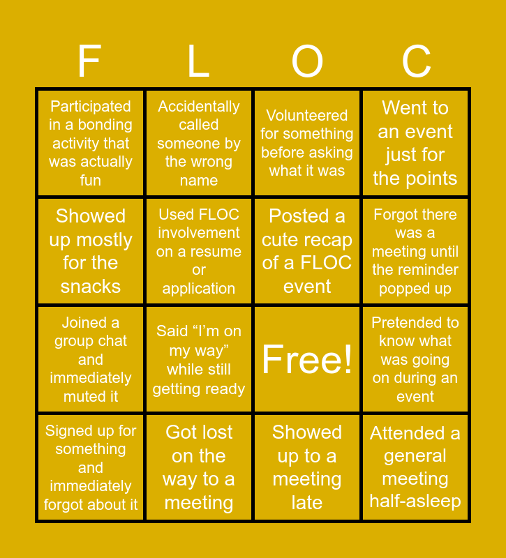This bingo card has 22 words: Got lost on the way to a meeting, Showed up matching someone unintentionally, Accidentally called someone by the wrong name, Attended an event just for the free shirt, Used FLOC involvement on a resume or application, Posted a cute recap of a FLOC event, Participated in a bonding activity that was actually fun, Volunteered for something before asking what it was, Free!, Attended a general meeting half-asleep, Joined a group chat and immediately muted it, Went to an event just for the points, Used FLOC as an excuse to not go out, Got lost on campus at least once, Showed up to a meeting late, Got distracted by your phone during a meeting, Pretended to know what was going on during an event, Signed up for something and immediately forgot about it, Said “I’m on my way” while still getting ready, Showed up mostly for the snacks, Forgot there was a meeting until the reminder popped up and Acted busy to avoid being asked to volunteer.