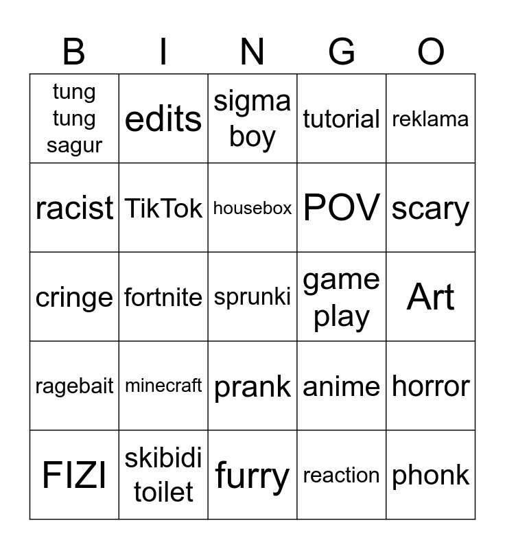 This bingo card has a free space and 24 words: minecraft, skibidi toilet, housebox, FIZI, reklama, tung tung sagur, racist, edits, game play, prank, POV, cringe, anime, horror, TikTok, reaction, Art, sigma boy, scary, fortnite, phonk, ragebait, tutorial and furry.