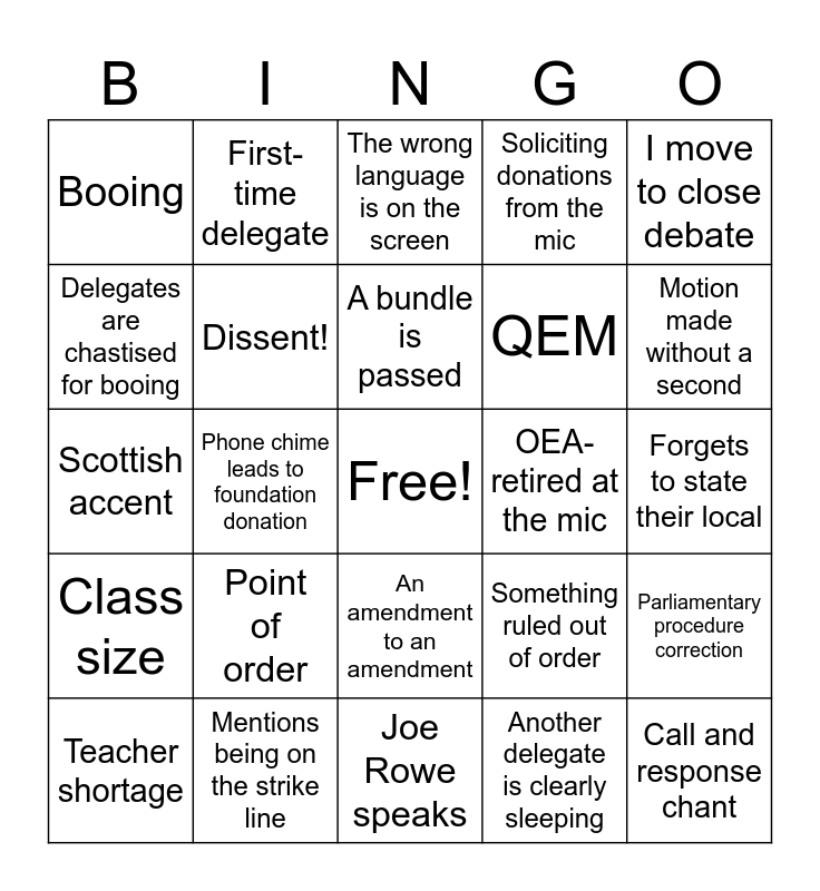 This bingo card has a free space and 25 words: Point of order, Joe Rowe speaks, A bundle is passed, Teacher shortage, I move to close debate, Booing, Delegates are chastised for booing, First-time delegate, OEA-retired at the mic, An amendment to an amendment, QEM, Scottish accent, Something ruled out of order, Parliamentary procedure correction, Dissent!, A mic doesn't work, Forgets to state their local, The wrong language is on the screen, Motion made without a second, Phone chime leads to foundation donation, Call and response chant, Mentions being on the strike line, Class size, Soliciting donations from the mic and Another delegate is clearly sleeping.