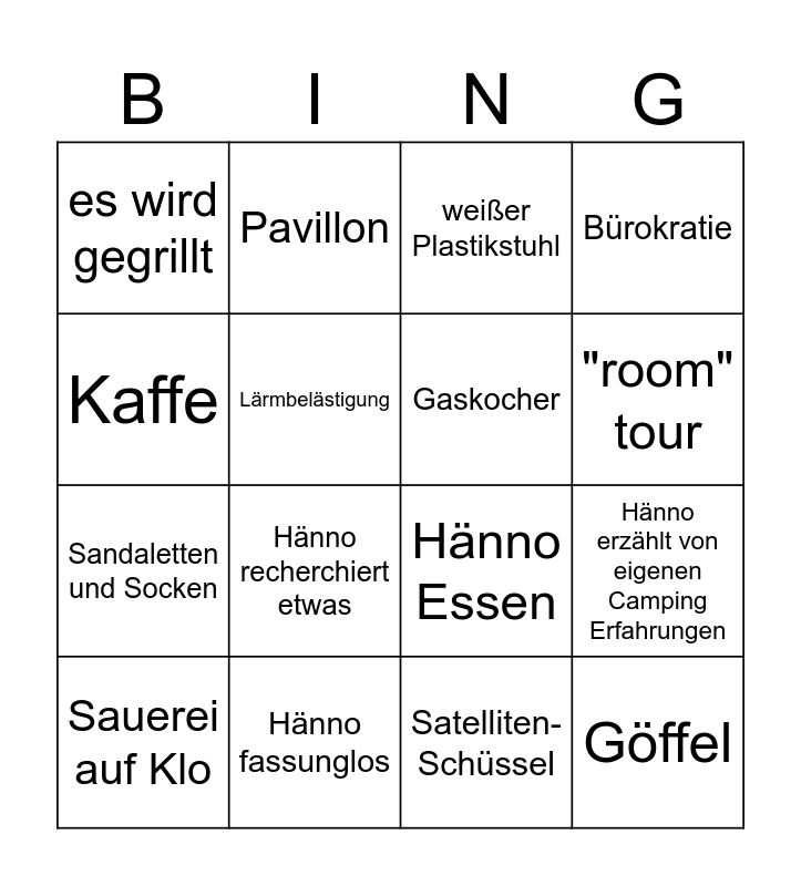This bingo card has 16 words: Hänno fassunglos, Hänno erzählt von eigenen Camping Erfahrungen, weißer Plastikstuhl, es wird gegrillt, Sandaletten und Socken, Pavillon, Hänno Essen, Satelliten-Schüssel, Kaffe, Lärmbelästigung, Sauerei auf Klo, Bürokratie, Hänno recherchiert etwas, "room" tour, Gaskocher and Göffel.