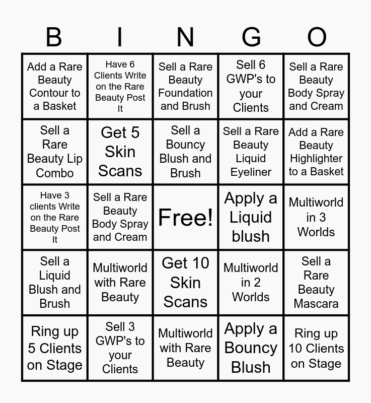 This bingo card has a free space and 24 words: Multiworld with Rare Beauty, Sell 3 GWP's to your Clients, Sell a Bouncy Blush and Brush, Ring up 5 Clients on Stage, Sell a Rare Beauty Body Spray and Cream, Add a Rare Beauty Contour to a Basket, Sell a Rare Beauty Lip Combo, Have 6 Clients Write on the Rare Beauty Post It, Apply a Liquid blush, Get 10 Skin Scans, Sell a Rare Beauty Liquid Eyeliner, Have 3 clients Write on the Rare Beauty Post It, Multiworld in 2 Worlds, Sell a Rare Beauty Mascara, Get 5 Skin Scans, Apply a Bouncy Blush, Multiworld in 3 Worlds, Sell a Rare Beauty Foundation and Brush, Add a Rare Beauty Highlighter to a Basket, Sell a Rare Beauty Body Spray and Cream, Ring up 10 Clients on Stage, Sell a Liquid Blush and Brush, Sell 6 GWP's to your Clients and Multiworld with Rare Beauty.