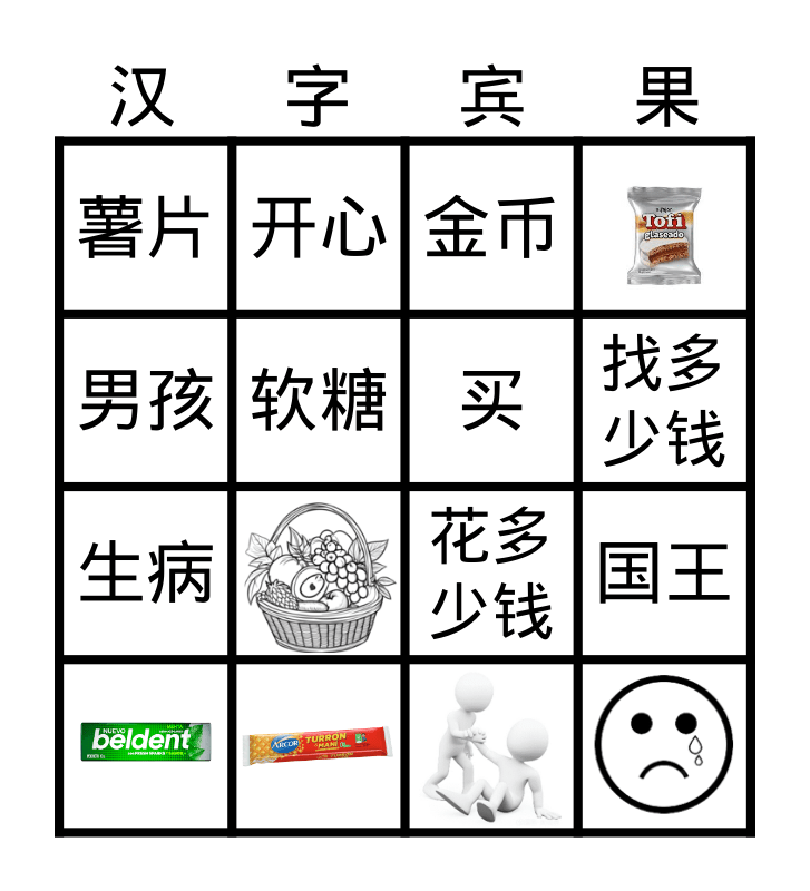 This bingo card has 6 images and 10 words: 国王, 金币, 薯片, 生病, 开心, 花多少钱, 男孩, 软糖, 找多少钱 and 买.