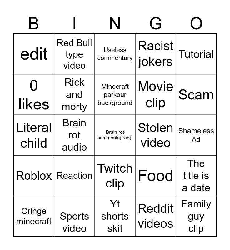 This bingo card has a free space and 24 words: Reaction, Sports video, Minecraft parkour background, Cringe minecraft, Tutorial, edit, 0 likes, Red Bull type video, Stolen video, Twitch clip, Movie clip, Literal child, Food, The title is a date, Rick and morty, Reddit videos, Shameless Ad, Useless commentary, Scam, Brain rot audio, Family guy clip, Roblox, Racist jokers and Yt shorts skit.