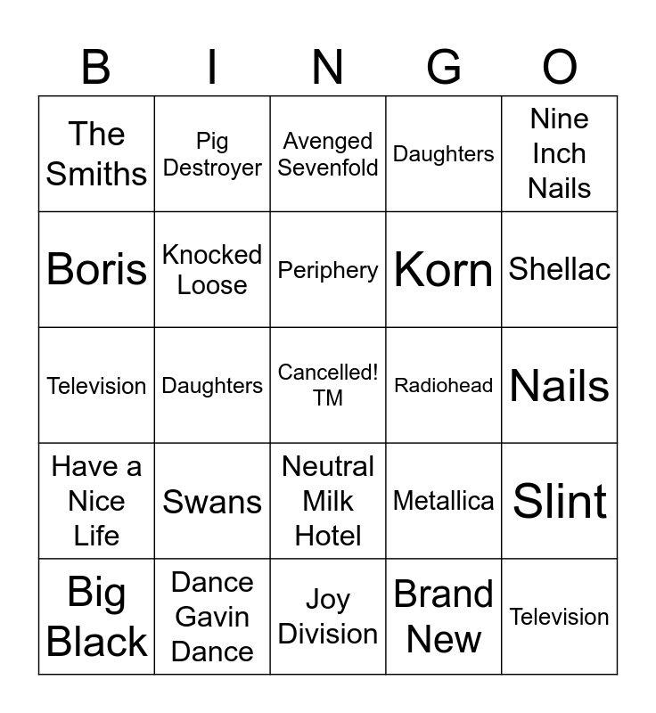 This bingo card has a free space and 24 words: Swans, Dance Gavin Dance, Periphery, Big Black, Nine Inch Nails, The Smiths, Boris, Pig Destroyer, Radiohead, Neutral Milk Hotel, Korn, Television, Metallica, Slint, Knocked Loose, Brand New, Nails, Avenged Sevenfold, Shellac, Daughters, Television, Have a Nice Life, Daughters and Joy Division.