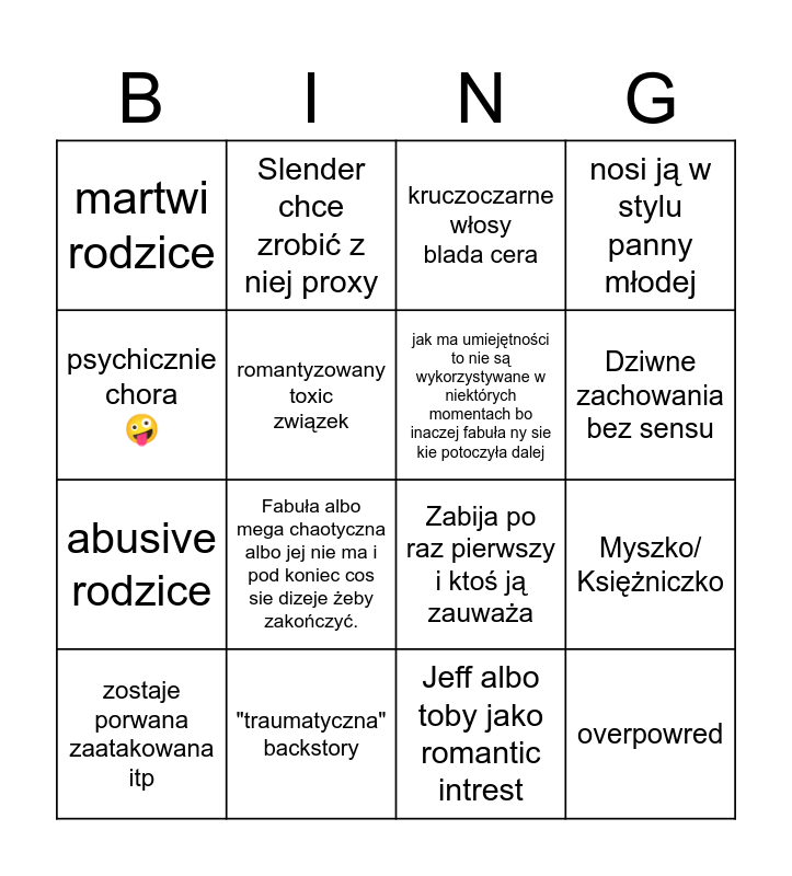 This bingo card has 16 words: "traumatyczna" backstory, Myszko/ Księżniczko, kruczoczarne włosy blada cera, martwi rodzice, abusive rodzice, Slender chce zrobić z niej proxy, Zabija po raz pierwszy i ktoś ją zauważa, Jeff albo toby jako romantic intrest, psychicznie chora 🤪, romantyzowany toxic związek, zostaje porwana zaatakowana itp, nosi ją w stylu panny młodej, Fabuła albo mega chaotyczna albo jej nie ma i pod koniec cos sie dizeje żeby zakończyć., Dziwne zachowania bez sensu, jak ma umiejętności to nie są wykorzystywane w niektórych momentach bo inaczej fabuła ny sie kie potoczyła dalej and overpowred.