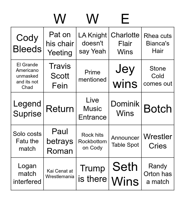 This bingo card has a free space and 24 words: Paul betrays Roman, Kai Cenat at Wrestlemania, Prime mentioned, Logan match interfered, Rhea cuts Bianca's Hair, Cody Bleeds, El Grande Americano unmasked and its not Chad, Pat on his chair Yeeting, Dominik Wins, Rock hits Rockbottom on Cody, Jey wins, Legend Suprise, Announcer Table Spot, Wrestler Cries, Travis Scott Fein, Seth Wins, Botch, LA Knight doesn't say Yeah, Stone Cold comes out, Return, Randy Orton has a match, Solo costs Fatu the match, Charlotte Flair Wins and Trump is there.