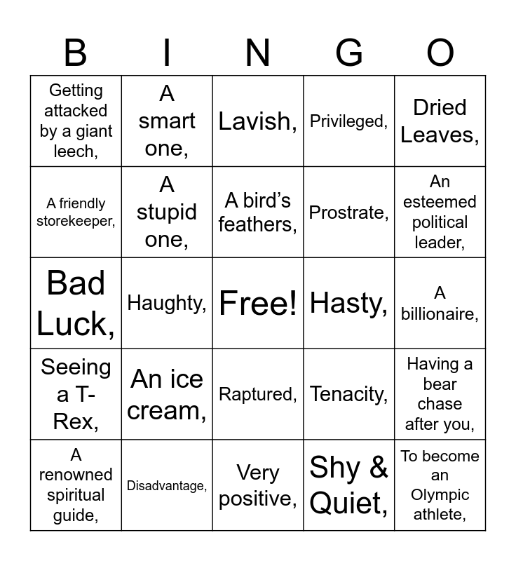 This bingo card has a free space and 90 words: Plucked,, Beseeched,, Raptured,, Pondered,, A dog,, Friendly & Loud,, Shy & Smart,, Friendly & Egotistical,, Hateful & Angry,, A teacher,, A philosopher,, A doctor,, A debtor,, A billionaire,, A miser,, A bird’s feathers,, A harp,, A violin,, A relaxed party,, A black-tie gala,, A first date,, An important religious meeting,, Very positive,, Mishap,, Bad Luck,, Disadvantage,, Subjugation,, Go to the store,, Bake cookies,, Conduct a science experiment,, Hang out at a friend’s house,, Having a bear chase after you,, Forgetting to turn in an assignment,, Seeing a T-Rex,, Getting attacked by a giant leech,, Privileged,, Lavish,, Gratifying,, Haughty,, An esteemed political leader,, A renowned spiritual guide,, A friendly storekeeper,, An old storyteller,, To take something off by pulling it,, To extract the plumage from,, Tenacity,, A noise made by chickens,, A squeal,, A cry,, A plea,, A snort,, Prostrate,, Plucky,, Pondering,, Consternation,, Cautious,, Hasty,, Daredevil-ish,, Fast,, A necklace made of sticks,, A headpiece decorated with foliage,, Objects made of natural materials,, A link made from foliage and blossoms,, Quite negative,, Neutral,, Thoughtful & Contemplative,, Short-tempered & Angry,, Shy & Quiet,, Talented & Popular,, A horse,, An ice cream,, To become an Olympic athlete,, A pool,, A failed one,, A smart one,, A stupid one,, Brown sludge,, A burnt custard,, Fruit,, Celery root,, Roses,, Dried Leaves,, Faux Fur,, Gratified,, Lavish,, Haughty,, Ew!,, Yum!,, Meh. and Pretty!..